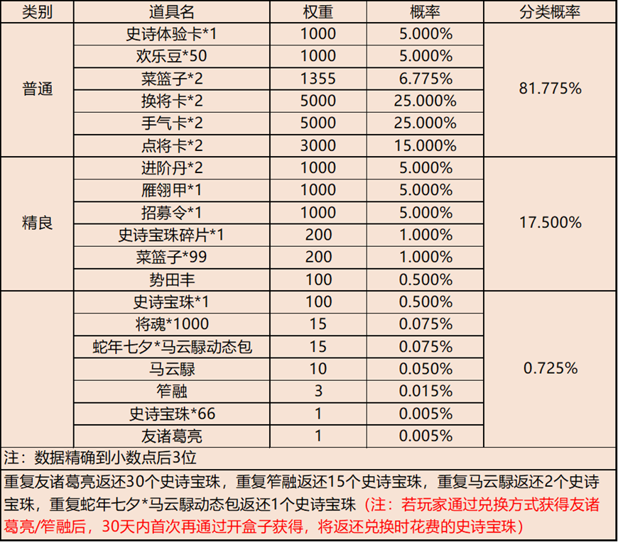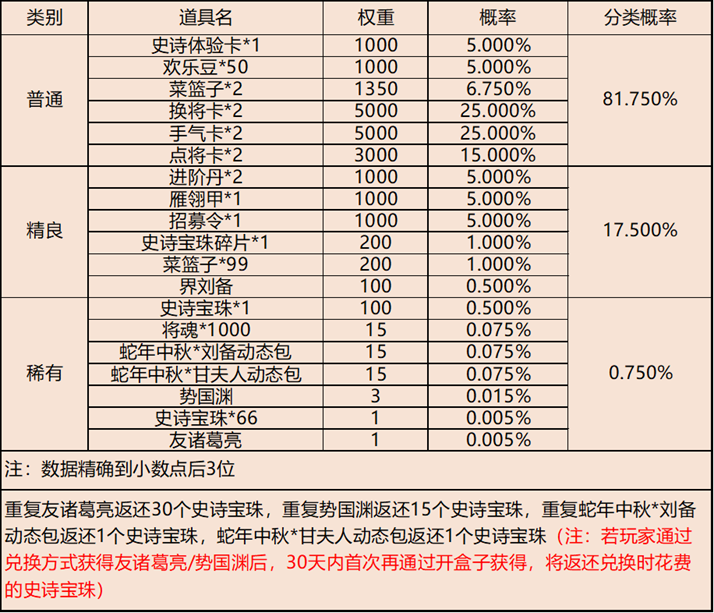 地点3-云梦泽 | 普通概率:50% | 稀有概率:30% | 史诗概率:15% | 传奇概率:3.5% | 神话概率:1.5% |